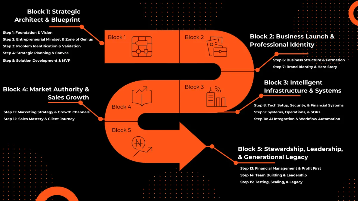 The journey begins with the foundation that most business owners skip (vision, personal values, and the entrepreneurial mindset required to sustain growth). From there, it moves through problem identification and strategic planning into solution development and brand building. Then it addresses the practical infrastructure most businesses neglect: legal structure, technology systems, the complete customer experience, and financial management. Finally, it builds toward the things that create lasting impact: AI integration and automation, team development, and the legacy planning that ensures what you've built can outlive you.